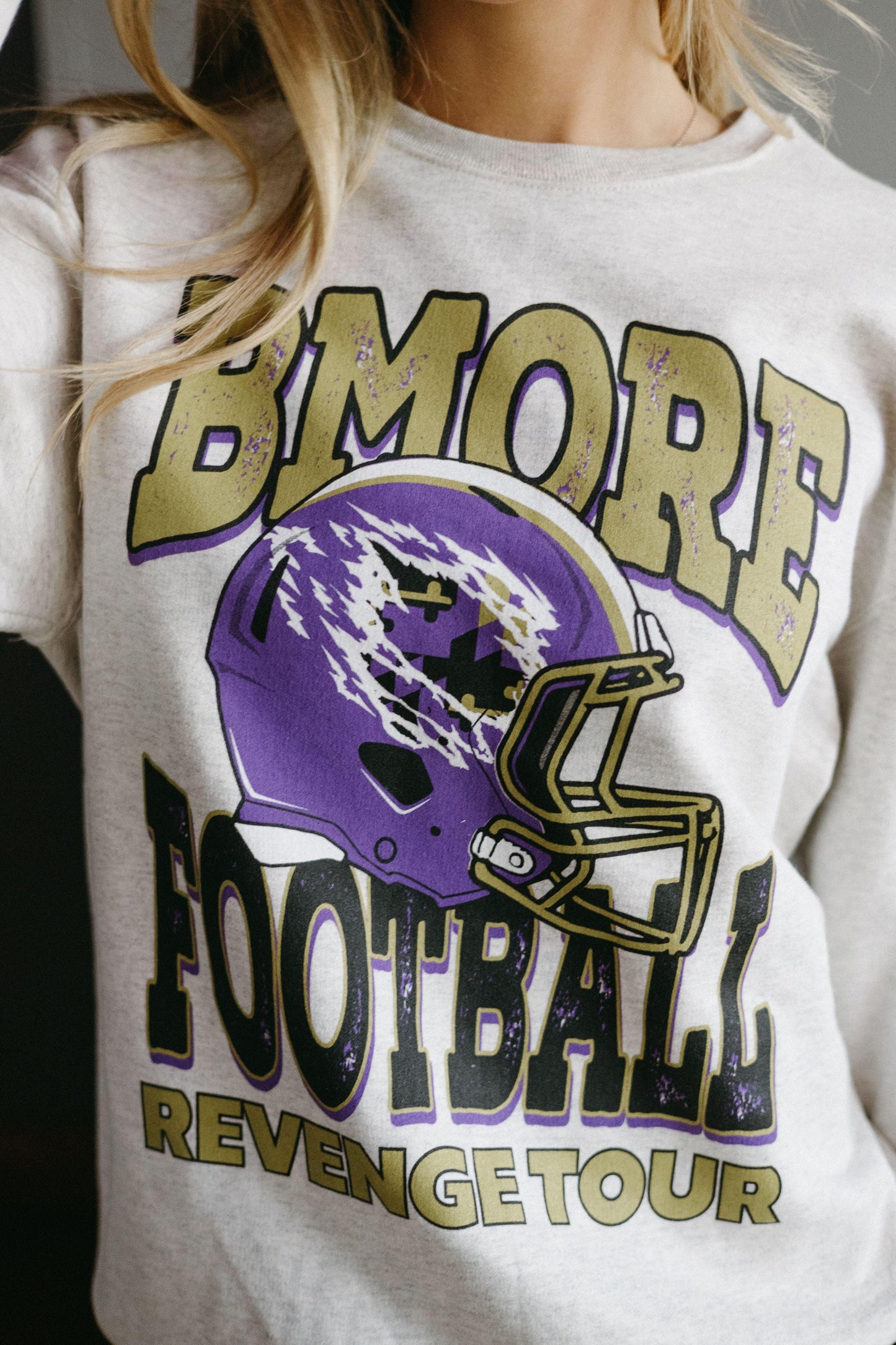 Stay warm and show your support with the Bmore Football Revenge Tour Sweatshirt, a standout piece from the Route One x Brightside Revenge Tour collection. This cozy oatmeal heather sweatshirt features a bold design with a purple football helmet and the powerful "Bmore Football Revenge Tour" text. Perfect for die-hard Baltimore football fans, this sweatshirt combines comfort and style, making it ideal for game days, casual outings, or lounging at home. Represent your city and join the revenge tour movement. Grab yours now - can't stop the flock!