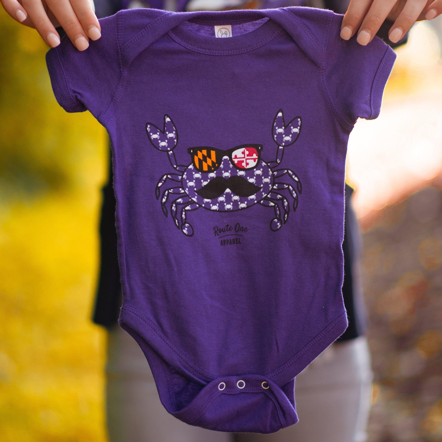 There's just no disguising your adorable little baby! This purple onesie features a cute crab with an impressive mustache and a pair of Maryland flag sunglasses. Ideal for Halloween, for April Fool's day, or for any day you and your little one are feeling fun and silly.
